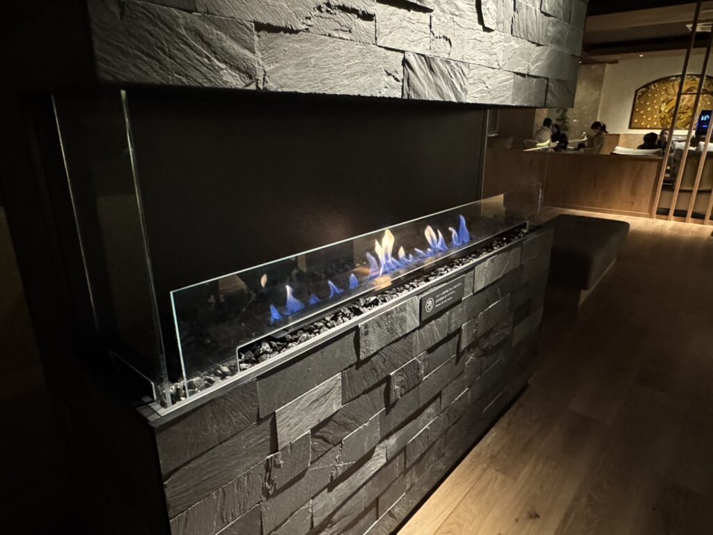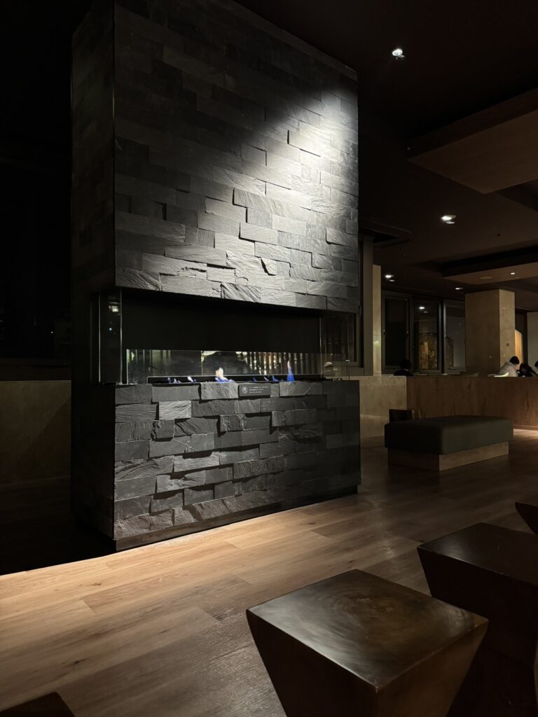 ホテルのラウンジは、落ち着いた間接照明も素敵でしたが暖炉があって、とても落ち着いた空間でした。