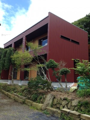 鹿沼市の赤いガルバと木板貼りのお宅です。