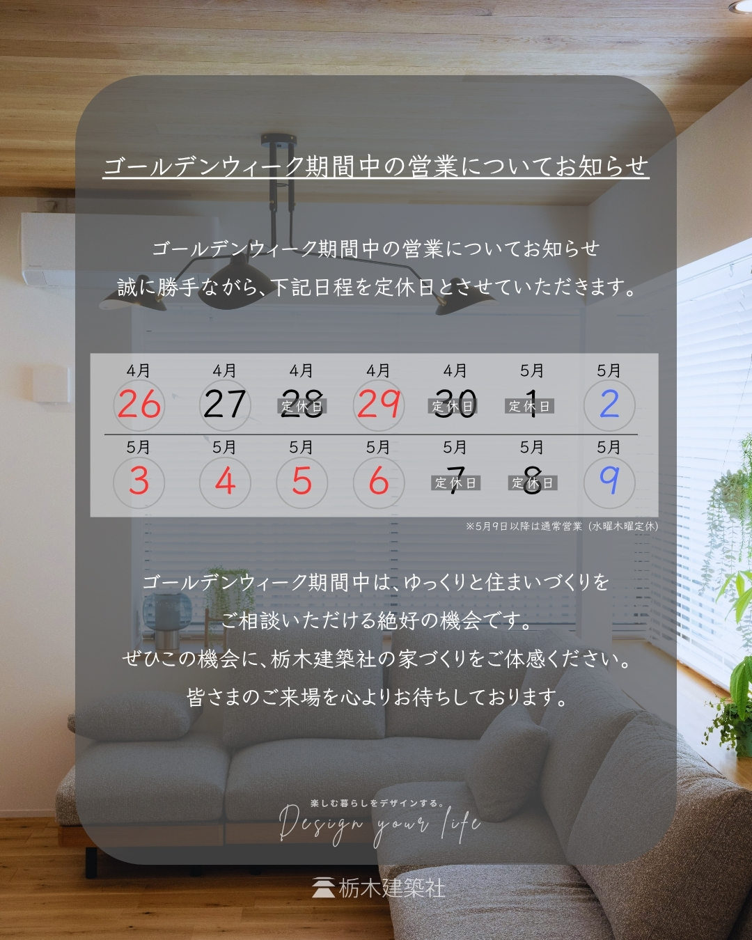 上記以外の日程につきましては通常通り営業しております。ゴールデンウィーク期間中は、ゆっくりと住まいづくりをご相談いただける絶好の機会です。